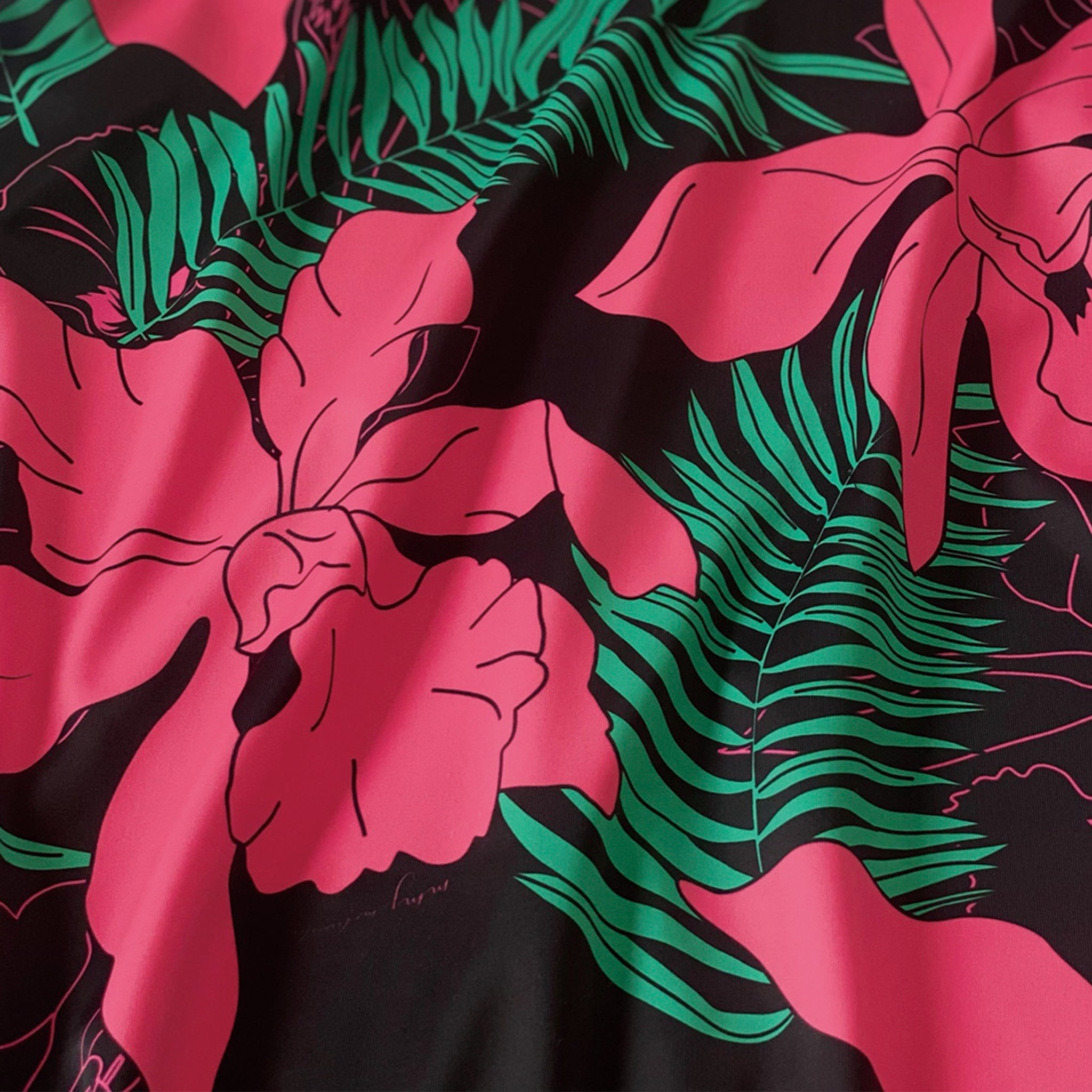 大人気のAラインドレスをMMJ modernistic japanならではの美しいシルエットに仕上げ、きめ細やかでしっとりと厚手の高級ストレッチ素材で再現しました。その光沢感と鮮やかな色合い、しなやかな伸び感や着心地、裾にたっぷり広がるフレアーと贅沢なドレープは、まるでステージに舞うフラクィーンのようです。生地とプリントは全て「Made in Japan」。リバーシブルケープのコーディネートでより一層ラグジュアリーに。