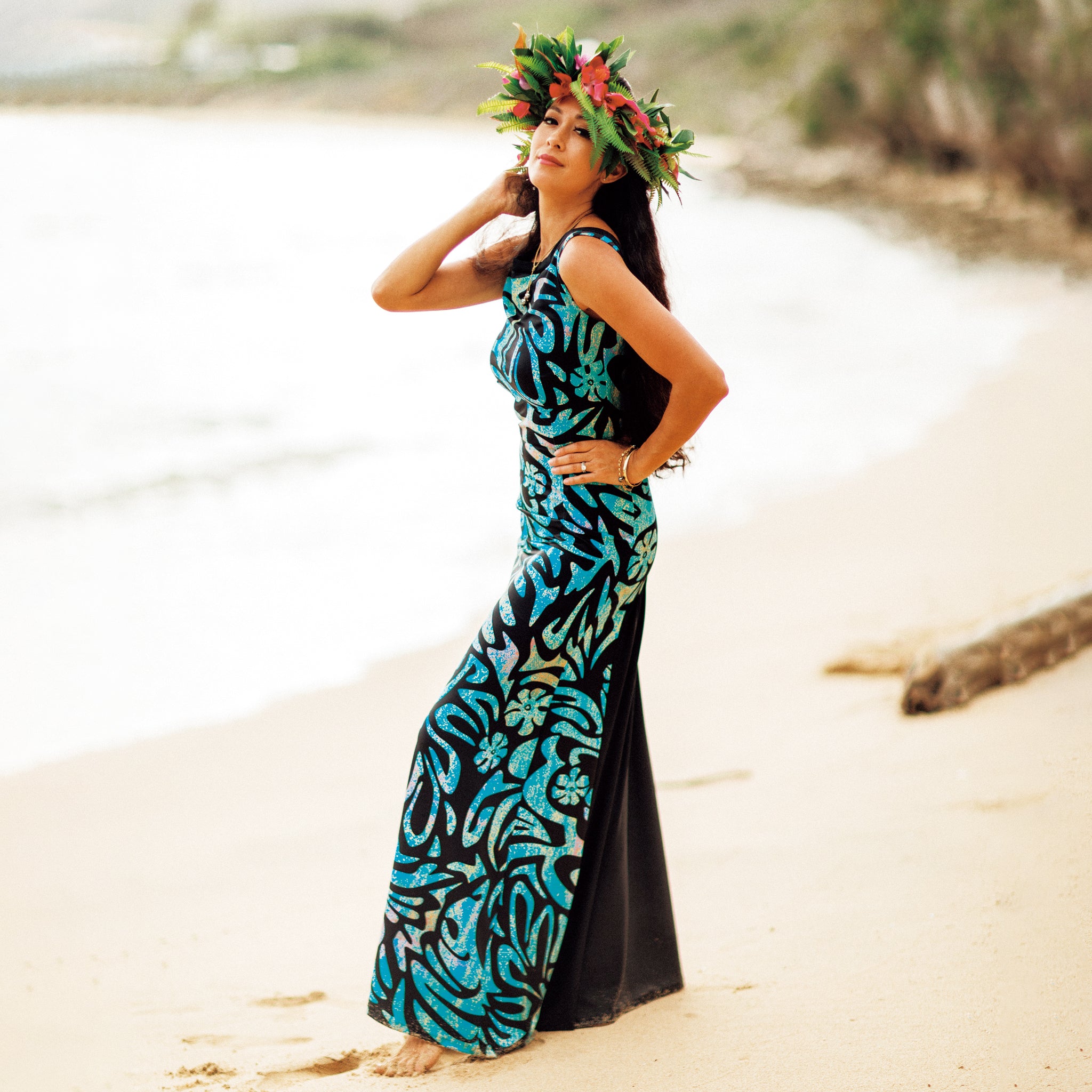 1着1着を手染めした様な細やかなテクスチャーと目を見張るほどに美しく鮮やかな色彩のポリネシアンデザインはMMJ modernistic japanが新たに提案する新しいステージドレスのスタンダード。サモアの伝統柄にアレンジを加えた大胆なデザインは、ノスタルジックでありながらも斬新でモダン。気品溢れる胸元と大胆に魅せる背中の開き、そして美しいマーメイドラインのシルエットとバックスタイルが最高にクールでビューティーな1着。