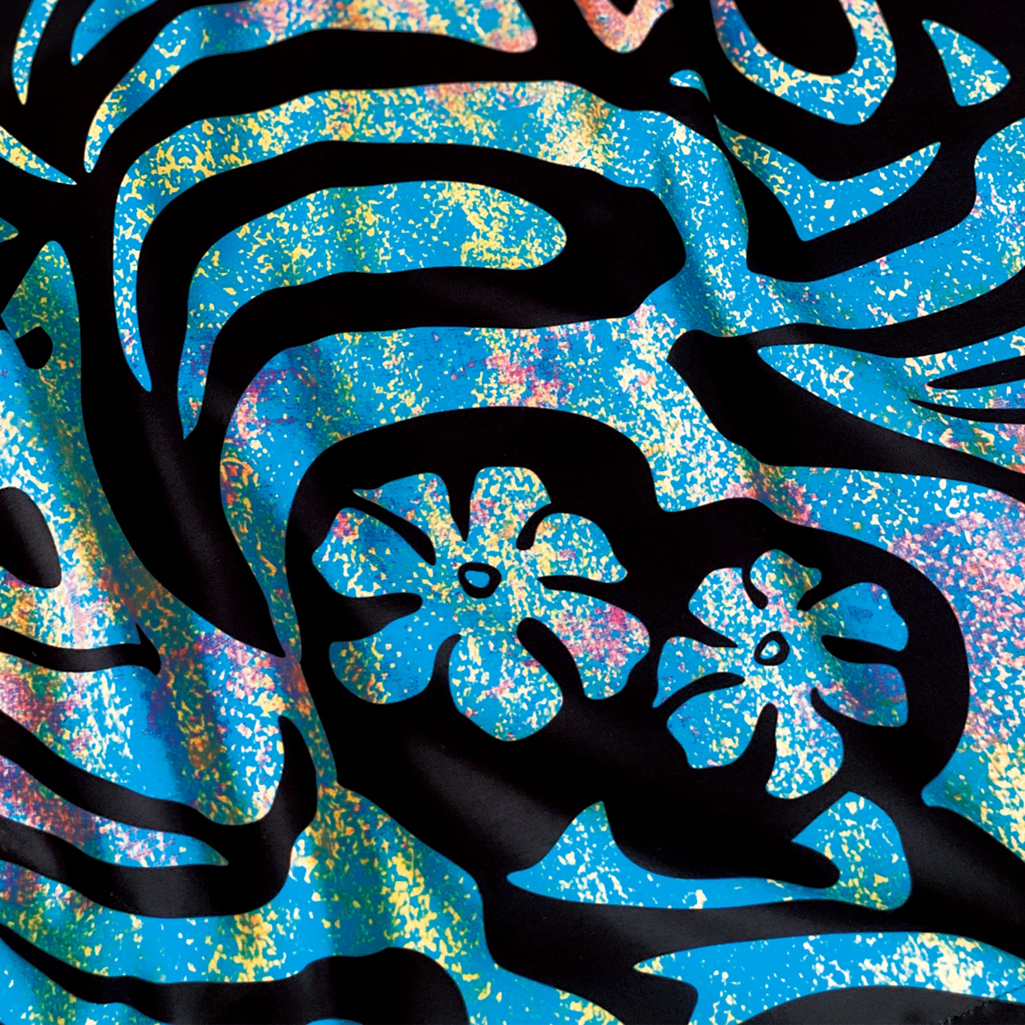 蒼く深く澄んだ太平洋の美しいブルーグラデーションを愛らしいティアレの花を織り混ぜてアレンジしたMMJ modernistic japanならではのトライバルデザイン。
