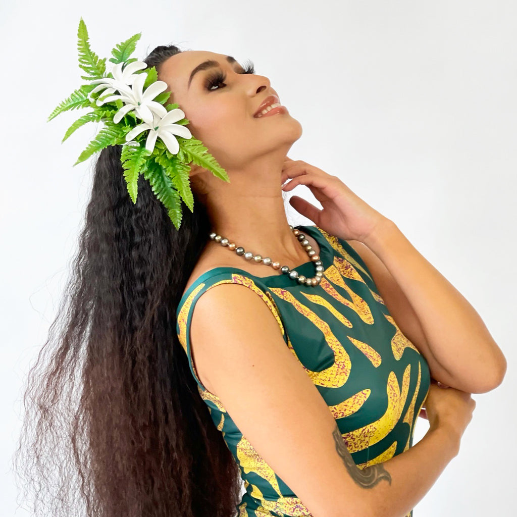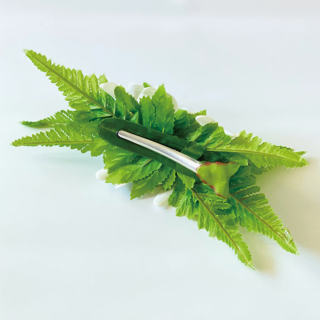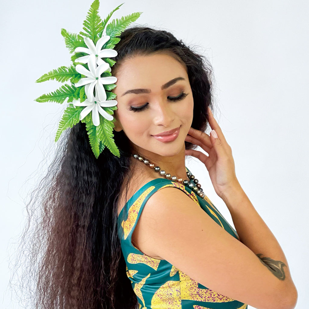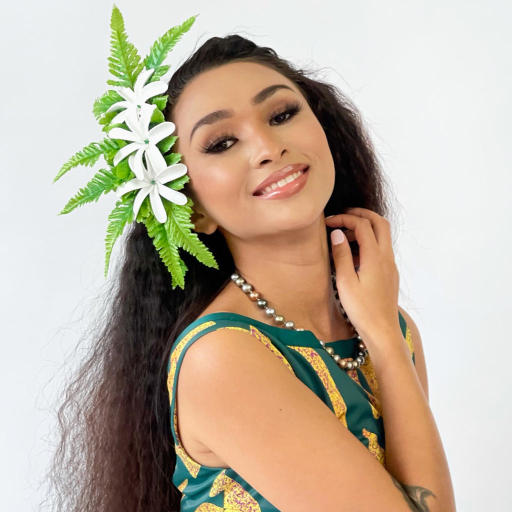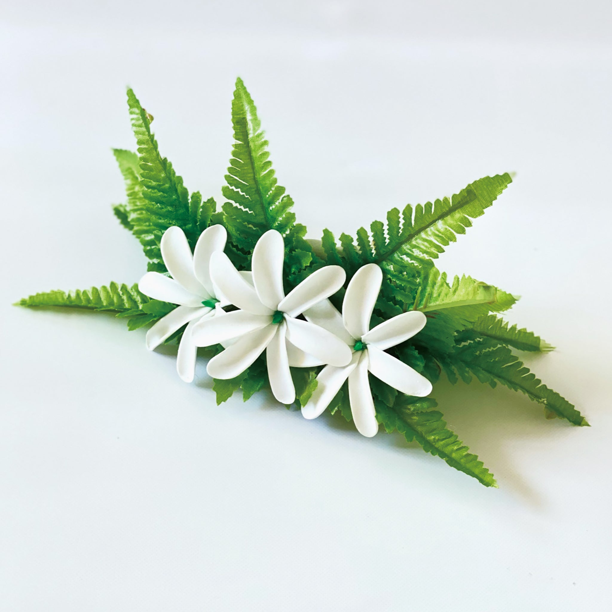 タヒチの代表的な花ティアレとレザーファンのシンプル且つ圧倒的な存在感のクリップ。3輪と2輪でどの方向から見ても美しくフォルム。