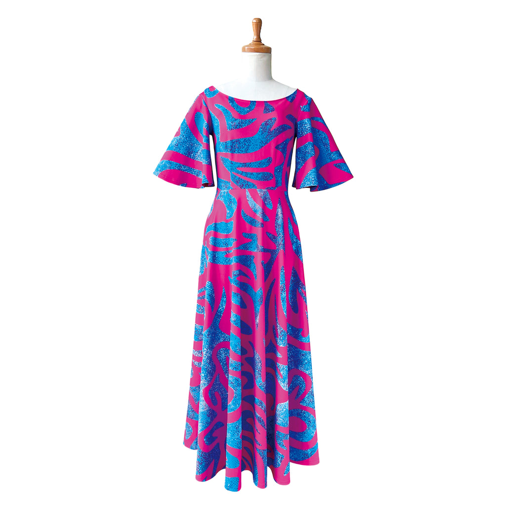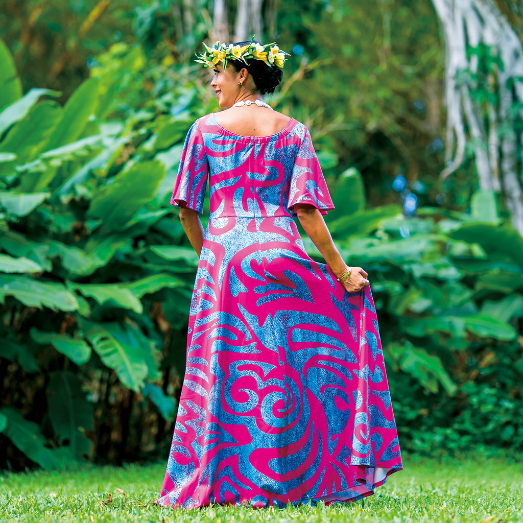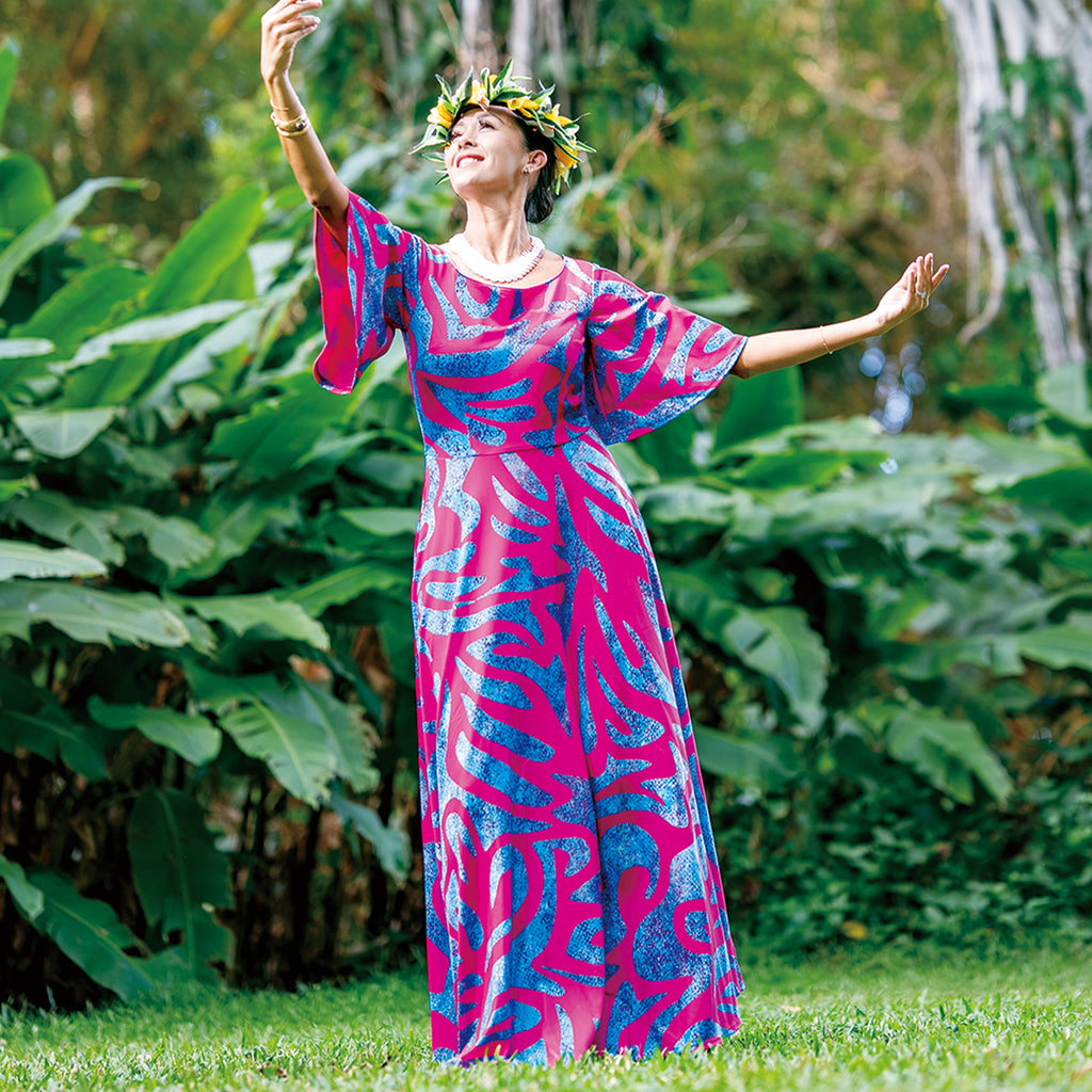 色鮮やかでトレンド感あふれるデザイン。ノスタルジックなサモアトライバルを鮮烈なリゾートピンクに映し出しました。華やかさと存在感を放つ、インパクト抜群のステージドレスです。