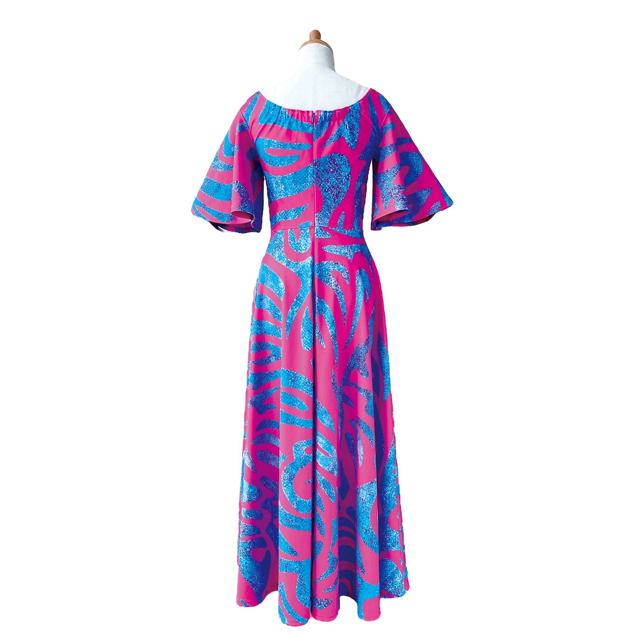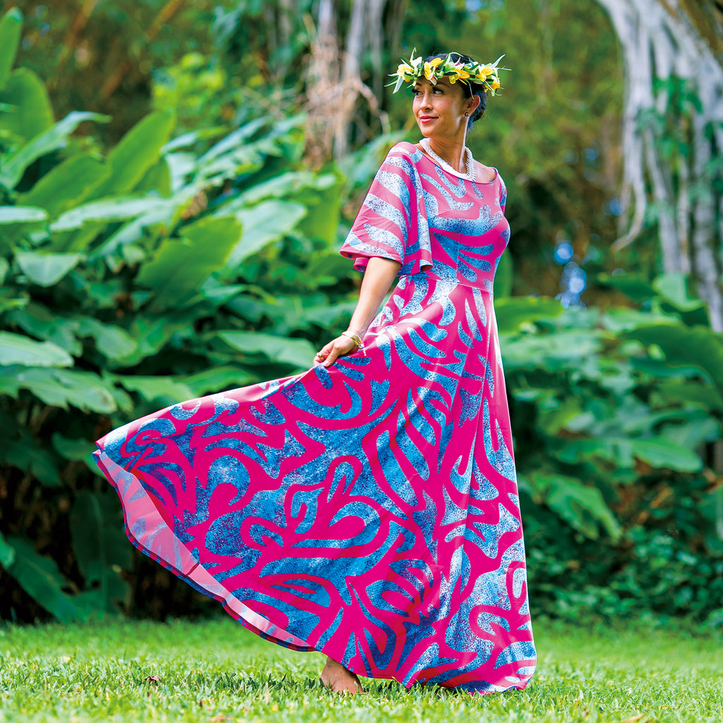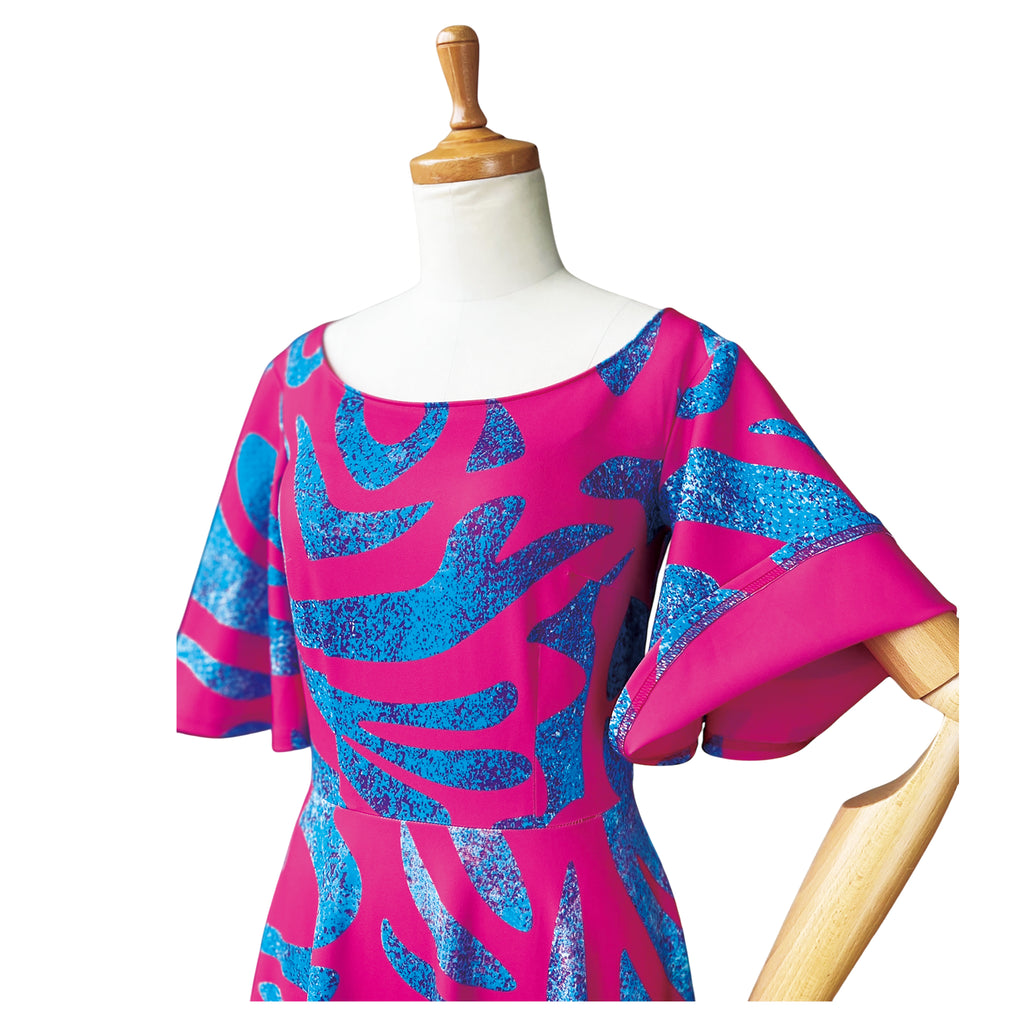 色鮮やかでトレンド感あふれるデザイン。ノスタルジックなサモアトライバルを鮮烈なリゾートピンクに映し出しました。華やかさと存在感を放つ、インパクト抜群のステージドレスです。